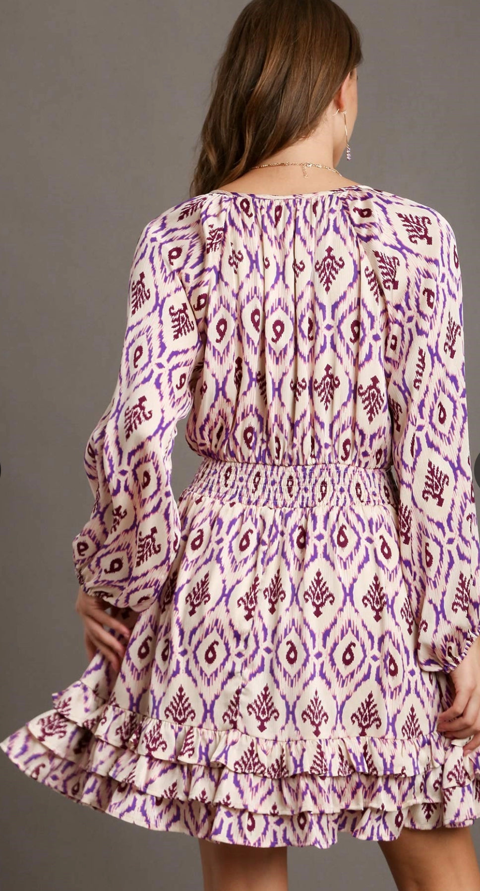Smocked Waistband Print Dress Featured Neck Tie & Puff Sleeves
