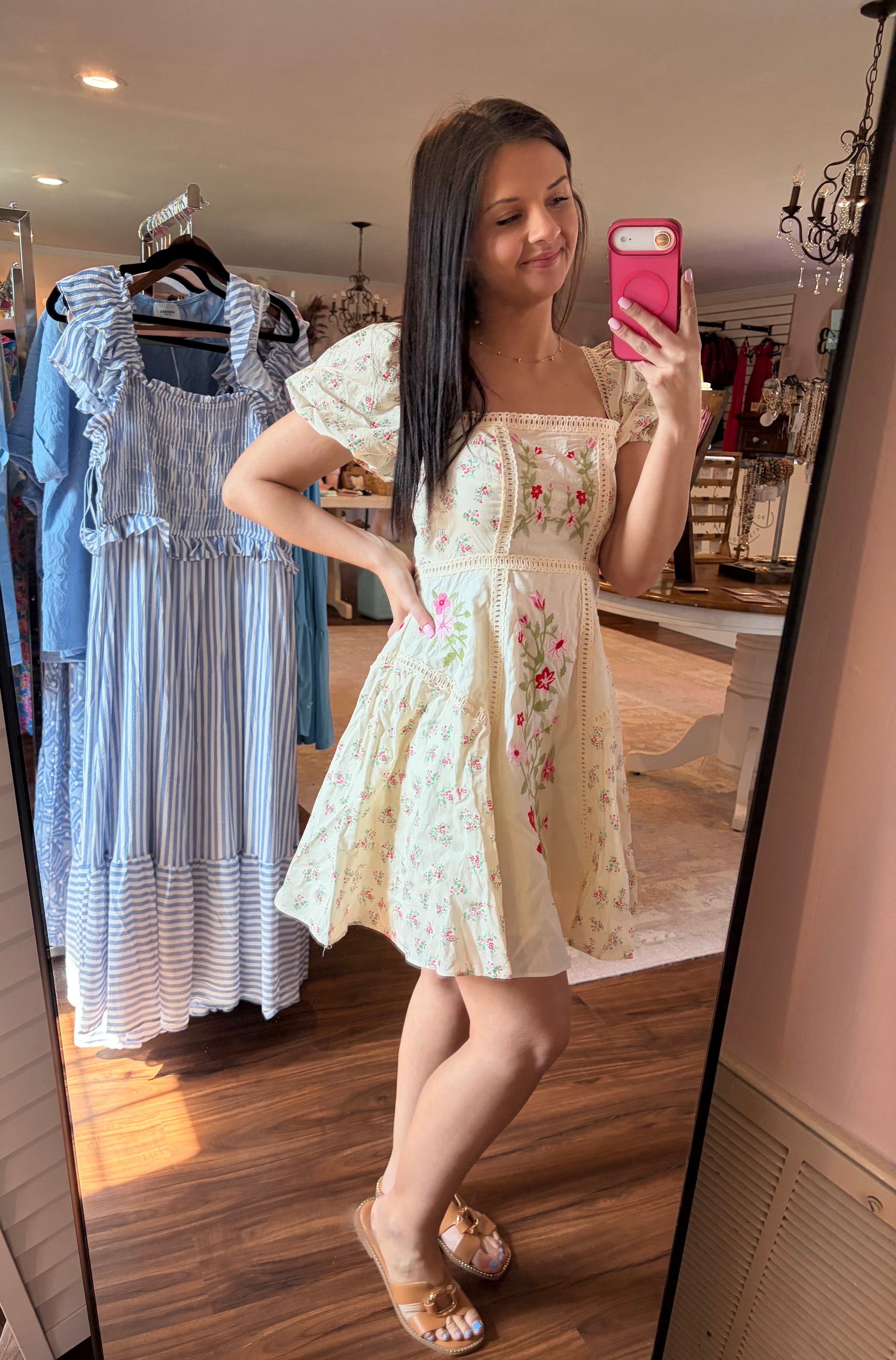 - This floral mini features embroidered mixed florals, mini length, puff sleeves, and a slight adjustable tie for sleeve security.